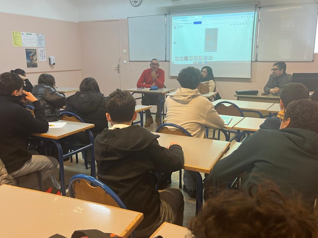 Mercredi 7 janvier, le Lycée Paul Valéry a eu le plaisir d’accueillir les artistes marocains Laila Bari et Abdallah Belabbes, reçus par Mme Lalanne, proviseure du LPV, à l’occasion de la clôture de l’exposition présentée au CDI durant la Semaine de la langue arabe.