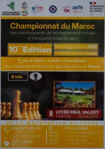 Le dimanche 18 mai 2025, Madame LALANNE, proviseure du lycée Paul Valéry de Meknès, et M.COLIN, proviseur-adjoint, ont eu l’honneur d’accueillir la 10ᵉ édition du prestigieux Tournoi d’échecs des lycées français et francophones du Maroc, événement désormais incontournable dans le paysage scolaire et culturel du réseau.